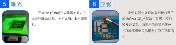 PCB板的光刻胶蚀刻法图解 本方法可用于实验室制备电致变色显示器件时,背电极电路的设计制作,及电子器件、电子设备PCB板的制作。该方法的特点是蚀刻所用的掩膜板可用激光打印机直接打印,适用于任何电脑能设计的图形。使用珠海凯为实验室用紫外固化器UV-1318只需要30秒的曝光时间。 |