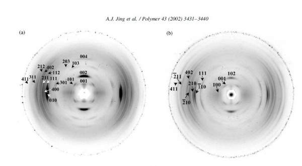求助!这是一个高分子结晶取向的样品,如何对这些峰进行指标化,确定晶胞参数,文献中只是提了“standard procedure”。我反复找了材料,只有一些针对一维粉末XRD的解析的资料。万分感谢 2D waxd.jpg |
