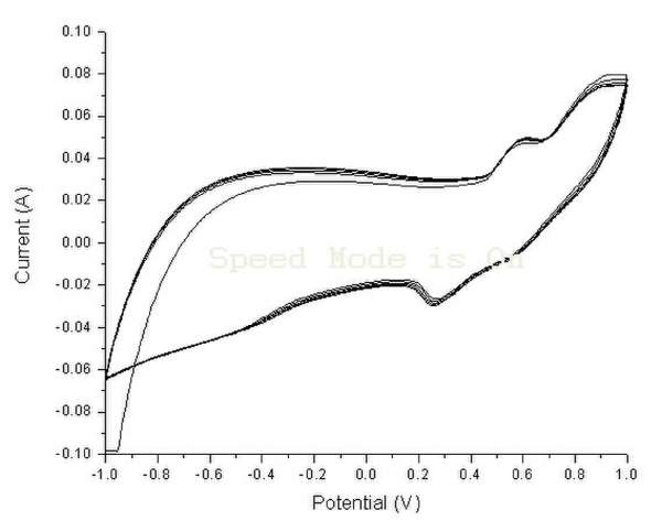 0.55V处一个氧化峰,0.25V处一个还原峰,这两个挺对称,好像是可逆体系。材料的稳定性挺好,后面重复几圈峰值变化不大,它应该就是可逆体系。0.85V处不知道是不是峰,负电位处可以不用扫的那么远了,水平不够,再等其他高手讲解一下吧