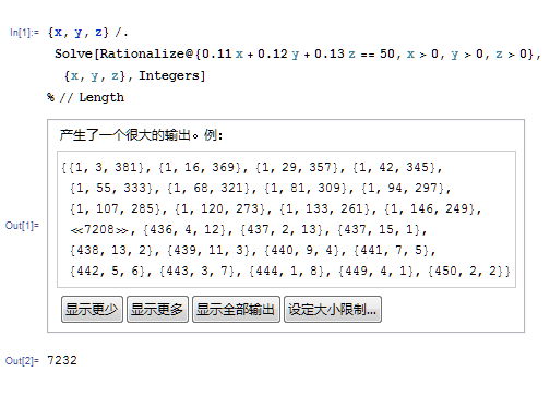 怎样用matlab编程解方程0.11x+0.12y+0.13z=50,其中x、y、z均为正整数。