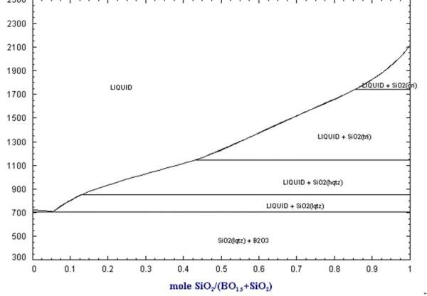 应该是问的是0.6处的反应过程,刚开始二氧化硅L和三氧化二硼,在七百度进行反应,三氧化二硼的浓度越高,二氧化硅的融合越多,同时随温度的升高而影响,并且可以根据上面的节点,判断反应的比例,如在0.12,0.45,0.88