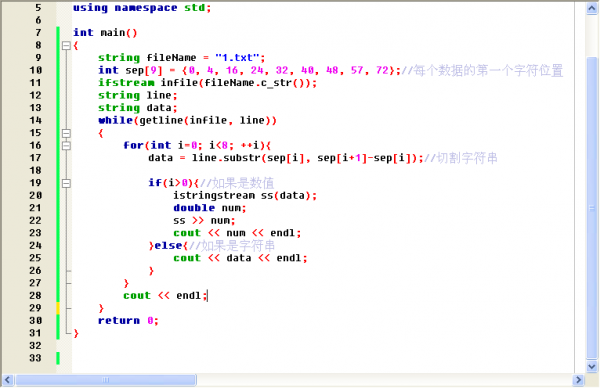 最近用C++写一段读文件的代码,遇到2个问题: 1)如果开头的几行不需要读写,该怎么跳过? 2)如果文件的格式固定(见附件),每行中的数字占的宽度一样,如 AAAA 1 09.0000003.000000 0.0 0 0 AAAA 2 012.00000 0.0 0.0 0 0 AAAA 3 06.000000 0.0 0.0 0 0 上面几行,每一行8个数字,但第3、4、5个数字中间无空格,即连在一起,该怎么处理?以第一行为例,8个数字分别为 AAAA 1 0 9.000000 3.000000 0.0 0 0。 这个问题困扰了好几天了,请大家指教,先谢谢了, |