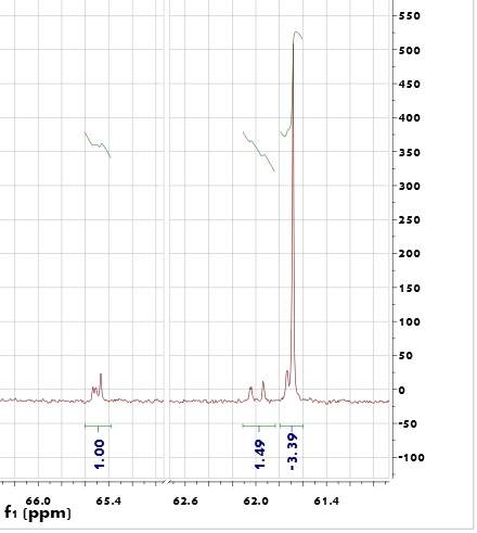 各位虫友们,最近送样做了个碳谱,解析聚合物端基伯仲碳的比例,但为什么积分后出现负值啊,以前没接触过,纠结啊!下面上图,接触过这方面的虫友请指教!