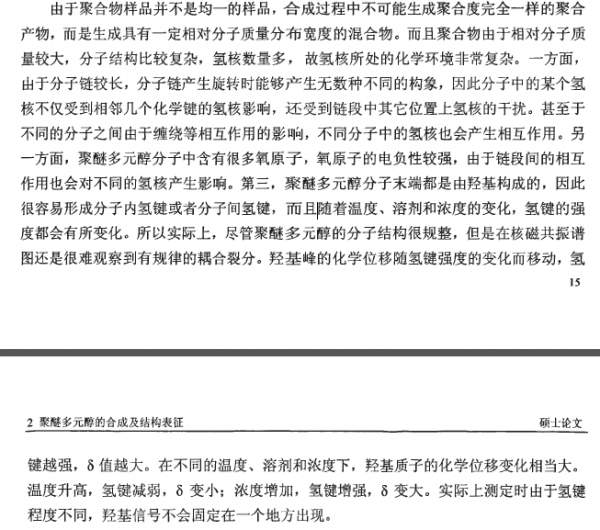 本来也打算这么做的,但是查了一下网上资料,基本这方面氢谱的研究,有一篇硕士论文给出了原因,我截了个图,第二张是他做的氢谱,1.1处为环丙甲基处质子的吸收峰,剩下的一个区域应该是其他所有氢了,本来聚合物端基氢相较于主链氢就比较少,可不可能都被覆盖掉了,所以氢谱不可行,我也不怎么太不懂核磁啊,已经晕了,所以想问一下是不是真的不可行啊!