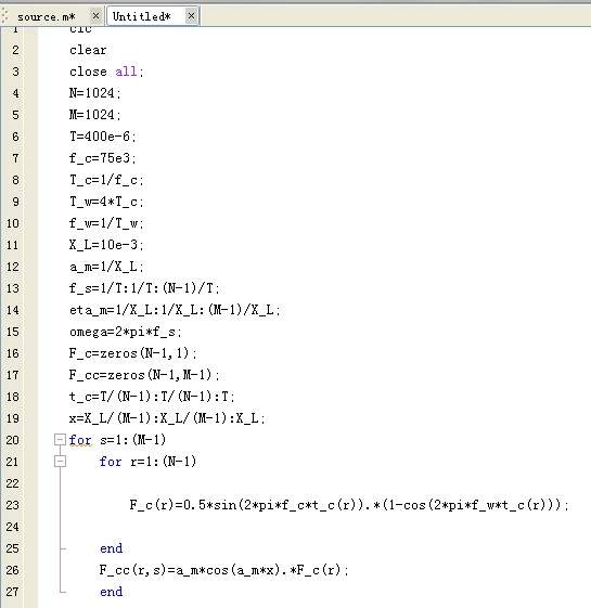 小循环如图,错误提示如题所示,是不是最后那个语句有错?该怎么调整? 顺便问一下要对最后的结果F_cc做傅里叶变换,有两个待变换量t_c和x(频域和空间域)怎么写?并且把图形做出来怎么做? 谢谢~ $GK6RMS_1[}L82T@SU}RB`P.jpg |