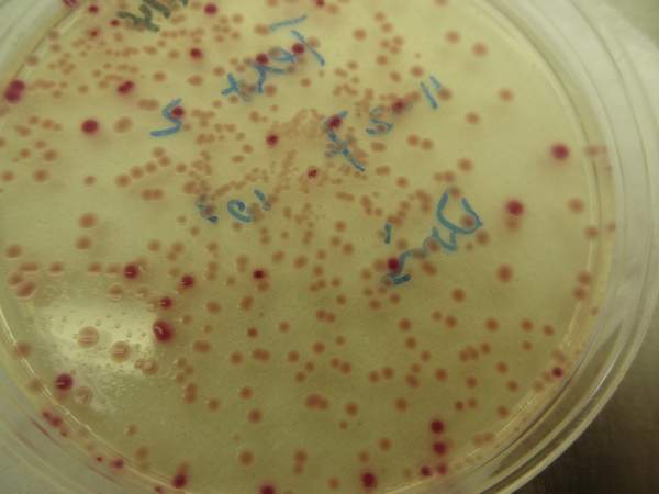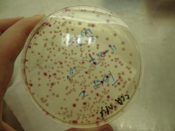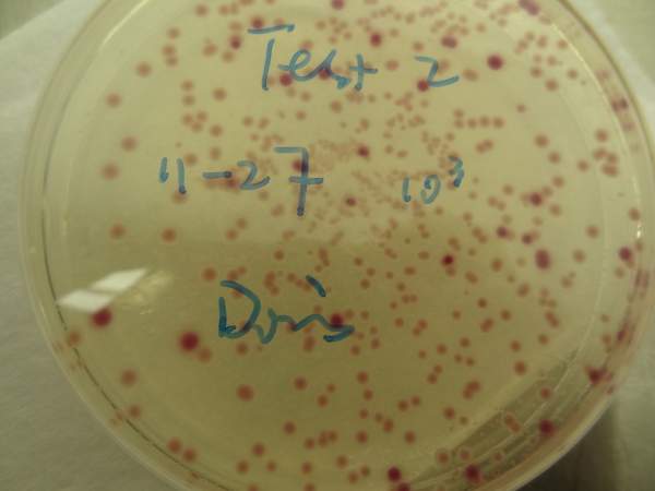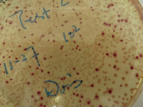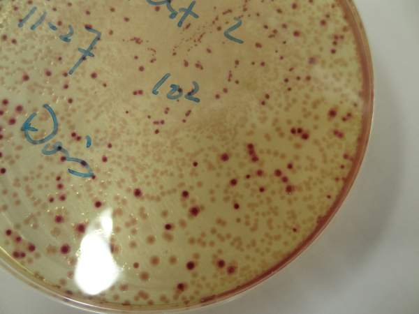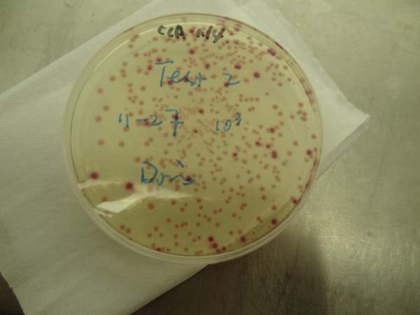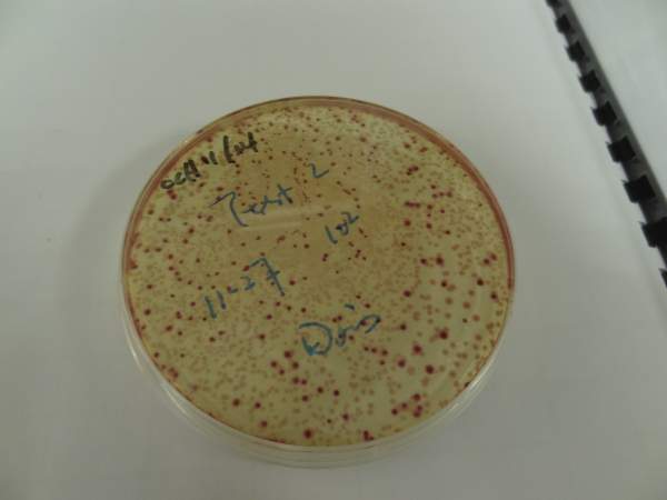 我上周做了一个CCA培养总大肠和E.Coli.的样品,培养出来之后,发现有两种相近的颜色呈现,一种是明显的紫红色菌落,另一种则是淡红色菌落,其中心粉色较明显,四周颜色很淡。照片是培养了48小时的情况。我也做了Colilert的方法,只是孔内变黄,并没有荧光呈现,也就是说明只有总大,没有E.coli。做的是污泥状垢样,第一次出现这种情况,现在不太清楚这种淡红色菌落是否算入总大肠,求解,多谢。