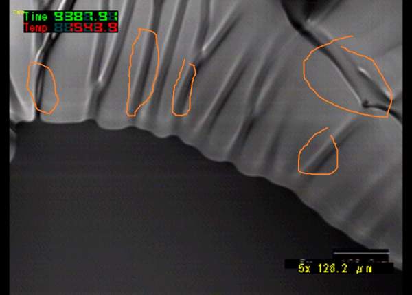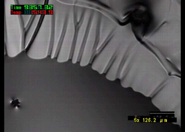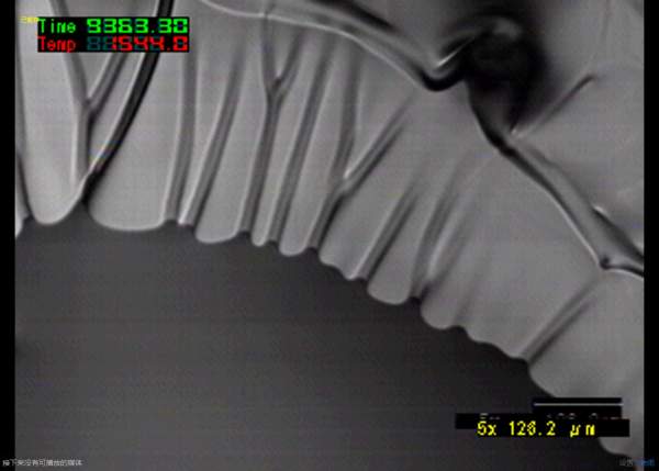 利用激光扫描共聚焦显微镜做了钢液凝固过程中高温组织转变实验,下面图片显示的从液相中析出delta铁素体的过程。从图像中可以看出delta铁素体不断长大向液相中推移,我想知道,图中画圈的部分,铁素体中楞状位置是什么?为什么delta铁素体不是平整的界面?求指教。