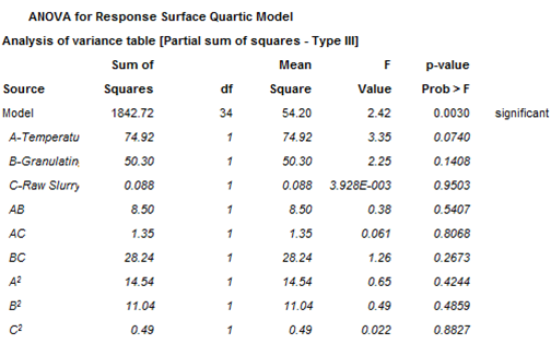 模型P值为0.0030为显著,说明模型是显著的,以下的A,B,C,A2,B2,C2,AB,AC,BC都大于0.05,说明都不显著,结果不太好,可能你前面因素选的水平太密了,没太大差异