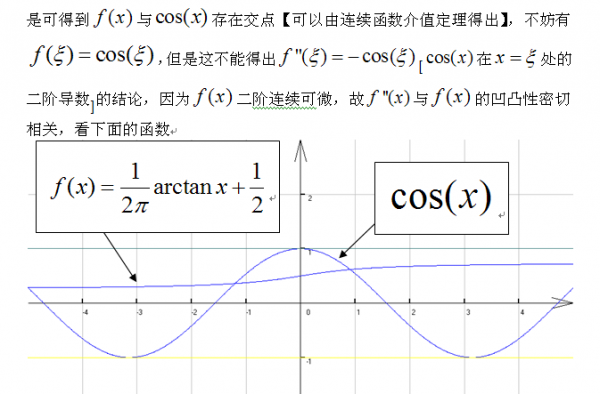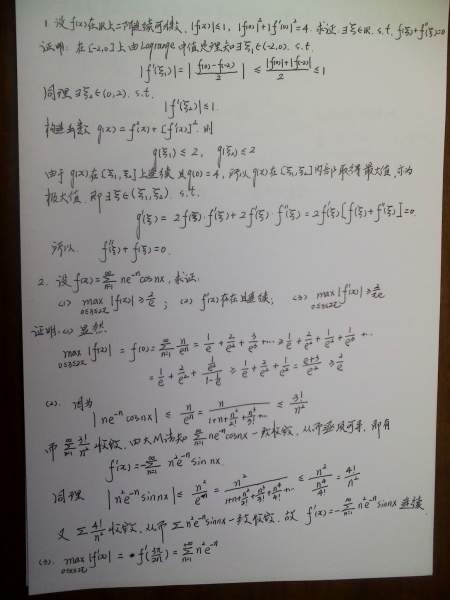 第二题: 利用 Sum_{n=1}^Infinity n* x^n = x/ (1-x)^2, 证明 f(0)= e/ (e-1)^2 > 2/e; f(Pi) = - e/ (e+1)^2. 进一步证明 存在0<x<Pi 使得 f’(x)= ( f(0)-f(Pi) ) /Pi = 2e/Pi * (e^2+1)/(e^2-1) > 2e/Pi. 第一题:我们假设命题不成立, 不妨设f(x) + f’’(x) >0. (否则可以考虑h(x)= -f(x), 它满足同样假设, 但是 h(x)+ h’’(x) >0 ). 不妨设 f’(0) >0, 否则可以考虑 f(-x). 考虑函数 g(x):= Integral_0^x [(x-t)*f(t)] dt + f(x)- f(0) -x * f’(0). 这个函数是特意设计满足 g(0)=g’(0)=0, g’’(x)= f(x) +f”(x). g’’(x) >0 指 g(x) 是凸函数, 在R上有唯一最小值 g(0)=0. 记f’(0)=a. 考虑 x=a, 那么 g(a)>0 以及 |f(x)| <=1 推出 Integral_0^ a (a -t)dt > f(0) -f(a) + a^2. 即 1/2*a^2 > f(0) -f(a) + a^2. 如果 f(0) >=0, , f(a) > f(0)/2 + ( f(0) + a^2)/2 >=2, 不可能的。 所以 f(0) <0. 这时,一个凸函数在上升段只能越升越快,我们断言存在f(d)=0 并且 d>0. 如果取d 使得f(x)在(0, d) 之间再无零点, 那么 f’(d) > f’(0)> sqrt(3) >d >0. 这时考虑 Integral_d^ x [(x-t)*f(t)] dt + f(x)- f(d) -x * f’(d). 并且取 x=f’(d), 那么应该有 f ( f’(d)) > 1/2 * f’(d)^2. 这是不可能的。 这勉强算是个七拼八凑的解答吧。 |