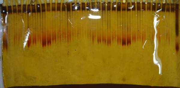 凝胶越快,胶体分子越不均匀。电泳时,温度一高条带就会向下弯。你的凝胶时间太长了,是不是TEMED失效了?