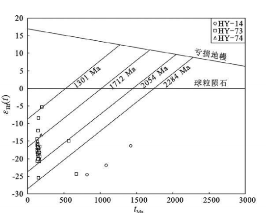这些线都是假定的地壳源区的Lu/Hf比,显然文章假设的是相同的比值,所以是平行的。固定的Lu/Hf比,演化线就是直线。两阶段模式年龄计算公式如下: THf2 = THf1 - (THf1 - t)((fcc - fs)/(fcc - fDM)) fLu/Hf = (176Lu/177Hf)S/(176Lu/177Hf)CHUR-1 其中,(176Lu/177Hf)S和(176Hf/177Hf)S为样品测定值,(176Lu/177Hf)CHUR = 0.0332, (176Hf/177Hf)CHUR,0 = 0.282772; (176Lu/177Hf)DM = 0.0384, (176Hf/177Hf)DM = 0.28325. fcc, fs, fDM 分别为大陆地壳、样品和亏损地幔的fLu/Hf。 t为样品形成时间,λ = 1.867×10-11 year-1。 |