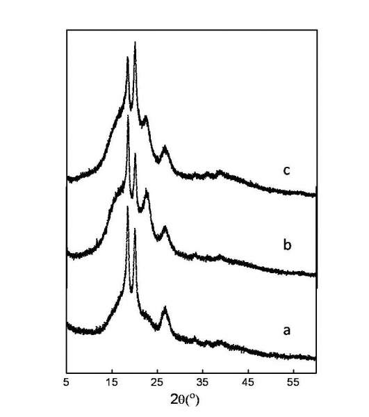 在20°附近主要有三个峰存在 19.9/19.8°为α-相;20.02°为γ-相;20.2°为β-相。其他还会在17-18.5°和26.5°左右出现α-相的衍射峰