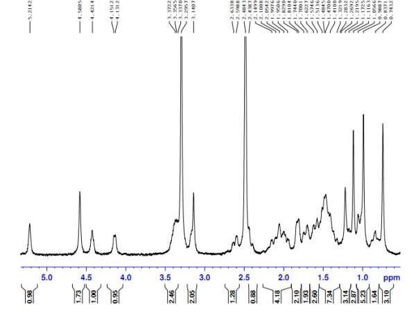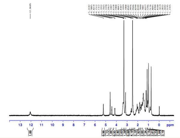 你这个化合物应该是个胆甾吧,你积分积得都不对,建议你去下载几篇甾体的文献对照看一看,先把骨架的核磁信息了解一下