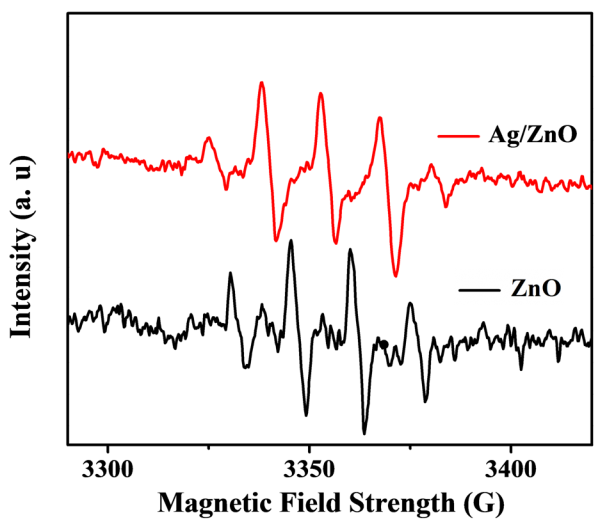 下面这个图是我们做的ESR的结果,在氧化锌和银/氧化锌的悬浮液中加入一定量的DMPO捕获自由基,可是得到的结果有点奇怪,有那位高人可以帮忙解释一下,附图: