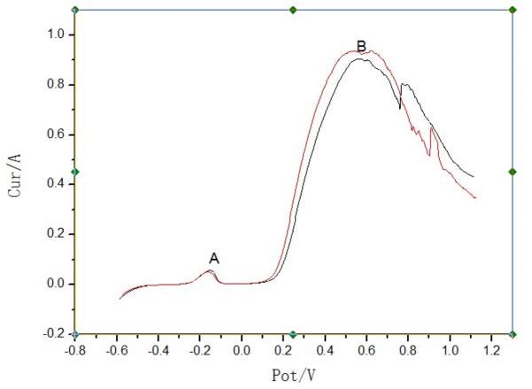 我的极化曲线做成这样,不知道怎么解释出现的两个峰值(A和B),在B后面的那个突起的部分也不知道是不是有个峰值,如果有请问对应的电极反应式什么?电化学学的一塌糊涂,请哪位电化学高手帮忙解释一下,这几个峰值处对应的可能的电化学反应式什么?谢谢! 2M38WPQ0T)_)S~A{@{E5)F0.jpg |