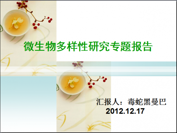 这是本人上研期间在课题组的学科研讨会上所做的一个关于微生物多样性的概述汇报PPT,现上传于论坛中希望有兴趣的童鞋可以浏览和参考!![]() [ Last edited by 々暧-〃 on 2013-12-15 at 13:33 ] |