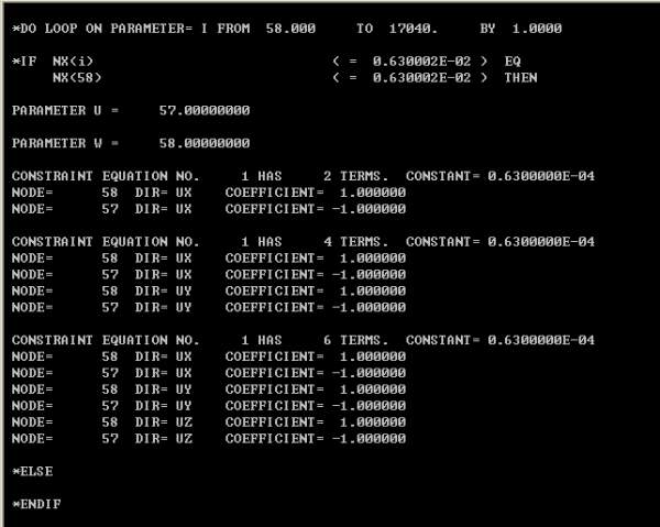 我想在体对称面上对应节点分别利用约束方程形成约束,填写了以下语句 Asel,s,loc,x,0.63e-2 Nsla,s,0 *GET,Nnum,node,0,num,max *GET,Nmin,node,0,num,min NSEL,all *Do,I,Nmin,Nnum,1 *If,NX(i),eq,NX(58),then u=NODE(0,NY(i),NZ(i)) w=NODE(NX(I),NY(I),NZ(I)) CE,1,0.63E-4,w,UX,1,u,UX,-1 CE,1,0,w,UY,1,u,UY,-1 CE,1,0,w,UZ,1,u,UZ,-1 *ELSE *EXIT *ENDIF *enddo但是结果如图,所示循环没有进行下去,约束添加好像也不多,怎么回事?请大神解答。附图可以在链接或者附件中看到 http://zhidao.baidu.com/question/1754140943550824188.html B1Z)VNS)28%MXIHSC2Z%WYU.jpg %%KR87[~TGO8MVHR9LLW~IA.jpg |