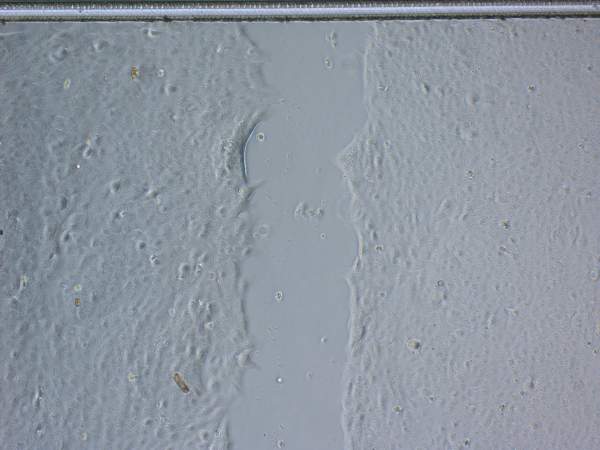 | 细胞培养24 h ,待细胞间形成较紧密的连接成单层后,用直径为1.5 mm的毛细管(或毛细管)在培养皿的中央垂直划一道痕迹(最好划十字型才好找位置拍照),且在显微镜下可同时看到创面两侧。划伤后吸出原培养液,每孔用200μL PBS 洗两次以除净未贴壁细胞,然后各孔加入不同终浓度为培养液400μL ,对照组仅加入DMEM培养液400μL 。每个浓度组设4个复孔。选择5 个不同视野,分别测量0 ,4 ,8 ,24 h 的划痕创面愈合情况。按迁移率% = (0 h 创面面积- t h 创面面积) / 0h 创面面积×100 % ,考察药物对修复的影响,图像处理用专业图像分析软件Imagepro-plus |