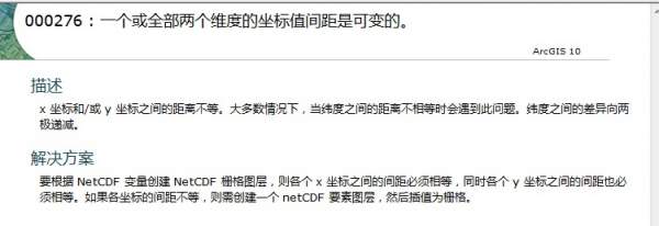 我从http://www.esrl.noaa.gov/psd/dat ... cep.reanalysis.html下载了NCEP/NCAR的一个.nc格式的辐射数据,通过arcgis的多维工具的make netCDF raster layer创建一个netCDF栅格图层,结果出错。问题与帖子http://bbs.esrichina-bj.cn/esri/viewthread.php?tid=109906遇到的一样。而且经NetCDF feature layer创建的要素图层也只有一个点。 arcgis报错说,error:000276 : 一个或全部两个维度的坐标值间距是可变的。 描述 x 坐标和/或 y 坐标之间的距离不等。大多数情况下,当纬度之间的距离不相等时会遇到此问题。纬度之间的差异向两极递减。 解决方案 要根据 NetCDF 变量创建 NetCDF 栅格图层,则各个 x 坐标之间的间距必须相等,同时各个 y 坐标之间的间距也必须相等。如果各坐标的间距不等,则需创建一个 netCDF 要素图层,然后插值为栅格。 连nc文件都无法打开创建了,更不用说后续操作了。那个帖子后面也没有给出解决方案。还请各位大神帮忙解决。 QQ截图20131218103729.jpg |