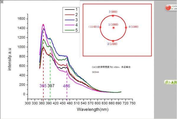 CeO2的禁带宽度为3.4Ev,本征发光峰为365nm,460nm-550nm为缺陷发光峰。但是我的纯CeO2,空气中热处理按理说氧空位非常少,397nm处是什么?高手帮忙分析分析。