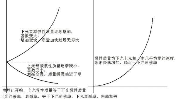具体分析在这里http://muchong.com/bbs/viewthread.php?tid=6689711 自己的猜想可以用一种计算来证实,基本实验几十年前就有人做过,有现成的数据 以下粗略的探讨这种计算 穆斯堡尔效应测引力红移 把红移光的比率,按质能方程,折算成惯性质量中两个方向,动量变化的比率,然后上光的红移,下光的蓝移,动量叠加(电子由静止开始自由落体,也可以折算成静质量,做近似的讨论) 可以推算出重力加速度 重力加速度和,引力红移率相比较, 如果用合适的参数,是否可以使两者成立等式,基本就可以证明自己猜想的真伪了 开始时,静质量增加缓慢, 极限情况,上光趋近于零,合动量几乎都由下光提供,速度趋近光速 红移蓝移电子对图 电子等粒子在引力场中的行为.JPG 电子在重力场中加速,惯性质量和上光下光的关系.JPG 上光的红移率,下光的蓝移率相等都是a(a随引力场强不同是变化的,简化计算讨论引力场强变化缓慢的情况,a近似不变) 引力红移, 上光能量逐渐衰减,衰减速度放缓,上光惯性质量:M上,根据质能方程,此质量为能量,具有动量 M上: 1-a 1-a-(1-a)a 1-a-(1-a)a-[1-a-(1-a)a]a 1-a-(1-a)a-[1-a-(1-a)a]a-{1-a-(1-a)a-[1-a-(1-a)a]a}a ...... 引力蓝移, 下光能量逐渐增加,增加速度加快,下光惯性质量:M下,根据质能方程,此质量为能量,具有动量 M下: 1+a 1+a+(1+a)a 1+a+(1+a)a+[(1+a)+(1+a)a]a 1+a+(1+a)a+[(1+a)+(1+a)a]a+{1+a+(1+a)a+[(1+a)+(1+a)a]a}a ...... 上光的红移率,下光的蓝移率相等都是a 粒子惯性质量M=M上+M下, 合动量Mv=(M下-M上)c,c为光速 Ft=Mv,动量变化率即是重力,重力加速度A=F/M=(M下-M上)c/(M上+M下)t [ Last edited by 峰锋风逢烽 on 2013-12-19 at 05:17 ] |