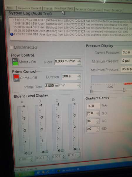 以前从没用过,有些问题很困惑,望大虾赐教 1 材料上说开机后要排气泡。拧开副泵。问题是哪个是副泵??离子色谱里面一共有几个泵?都在哪里?我只知道有一个主机箱一样的东西(sp/dp)里面是泵,,,可以给发个实物图吗??这些泵对应的工作站的里面的是哪个键?我看软件的泵选项卡下面有一个 “fiow control” 和“prime control” 2 有的材料上在讲开机的时候说是 排完废液后开泵启动仪器(排废液的时候不是已经开泵了吗???),待系统压力超过1000psi,打开RFC电源并设置KOH浓度,打开RFC面板前的EGC电源,抑制器有液体流出时,打开RFC面板上的AES/SRS电源,废液管中有液体流出时,打开RFC面板上的CR-TC电源。 我的疑问是,在仪器上九没见到有RFC、EGC、AES/SRS、CR-TC电源呀???是集成了吗?? 3 正确的开机步骤呢 ??? [ Last edited by cly2810 on 2013-12-19 at 13:42 ] |