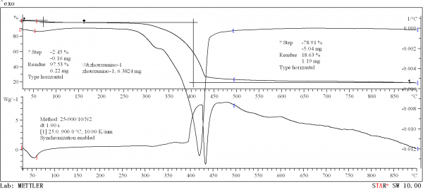 我的热重图在130到600°的有机物的分解大于有机物在整个杂化材料中的含量,请问这是怎么回事?杂化材料是杯芳烃与多酸的杂化材料,杯芳烃中有C H N O 四种元素。求急!! BC-LI-EuW10 n=5.png |