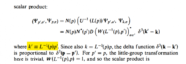 正在读Weinberg 的量子场论第一册,在66页,他用了一个关系,就是图中黄色高亮的公 式。 这里我有所不解。根据我的理解,带撇的k只能用L(p')的逆作用到p' 得到。而这个式子 里用的确是L(p),括号里面的动量不带撇。 为啥??? wenti.PNG |