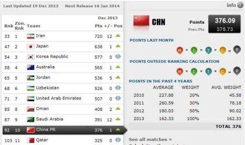 FIFA年终排名:国足第92位 近4年最低历史第三差
