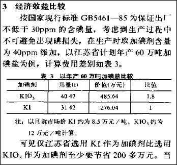 (1)我国碘盐碘化钾含量为1/20000­一1/50000,计算价格应该分别计算,或用平均值,而不应该只用最低含量数值,只用最低值计算会有很大误差。如果按1/20000计算,用碘酸钾比碘化钾就不是多0.21元,而是要多3.8-3.275=0.525元