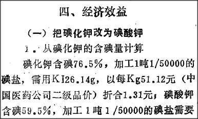于志恒说:“碘化钾含碘76.6%,加工1吨1/50000的碘盐,需用KI26.14g,以每Kg51.12元(中国医药公司二级品价)折合1.31元;碘酸钾含碘59.5%,加工1吨1/50000的碘盐需要33.69,克,以每kg45.4元计,折合1.525元,这样每加工1吨1/500000的碘盐,用碘酸钾比碘化钾要多1.52-1.31=0.21元。图2