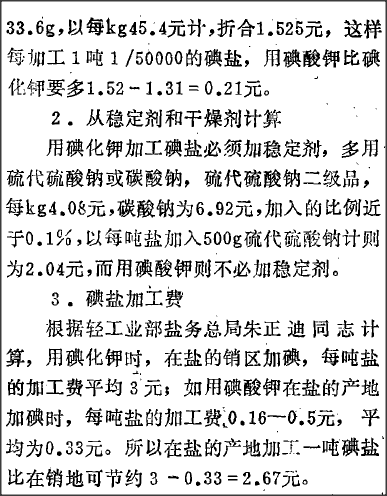 于志恒说:“碘盐加工费根据轻工业部盐务总局朱正迪同志计算,用碘化钾时,在盐的销区加碘,每吨盐的加工费平均3元;如用碘酸钾在盐的产地加碘时,每吨盐的加工费0.16一0.5元,平均为0.33元。所以在盐的产地加工一吨碘盐比在销地可节约3一0.33=2.67元。”