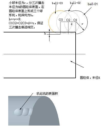如下图,用一个钢球(半径为r)分三次撞击一个圆柱体(半径为R>>r),在圆柱体上形成了三个球形坑。需要确定第三次撞击时形成的坑的表面积。如果是撞击平板后形成球形坑,其第三个坑的表面积怎么求?网络上有球冠面积公式,不适用。 Snap1.jpg |