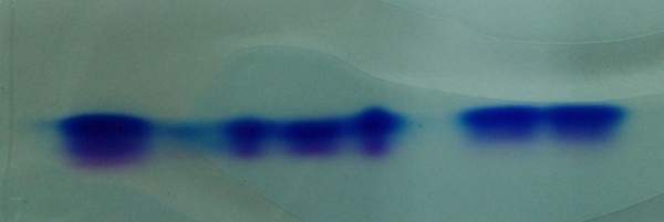 大分子的条带还可以,但是小分子量的颜色很浅,但是跑电泳时溴酚蓝的指示前沿没有跑出胶外,所以蛋白应该也没有跑出胶的范围。求高人解答。 这个是原来比较好的时候,底部的蛋白还大致能跑出来 这个是后来的,底部的条带就分散的不好了 这个是今天跑电泳时拍的,有个泳道的有一条好像渗漏的线,谁能告诉我原因在哪? 电泳跑完后的溴酚蓝指示剂,压得不好,原因在哪?pH吗 最新跑的,脱完色之后底部的条带更分不清拉 |
