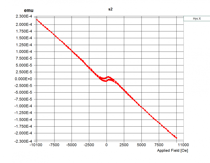 抗磁是一条过原点的负斜率的直线,铁磁表现为磁滞回线。你的结果是二者的叠加。在曲线上直线部分拟合出斜率,即为抗磁部分的斜率;再用总的数据减去抗磁部分(过原点的负斜率直线),余下即为磁滞回线,是铁磁部分。 然而其各自起源,我还不明白。