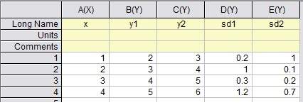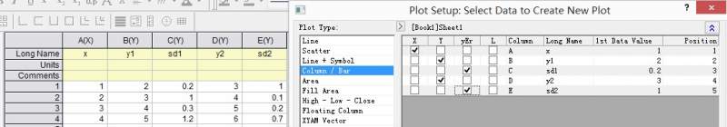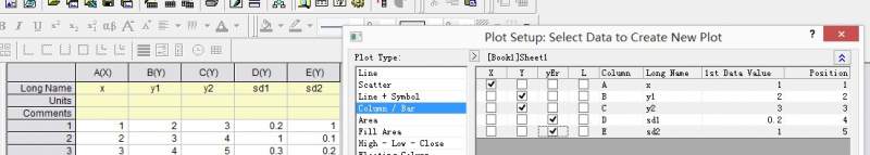 就像我刚才那么做就可以了啊,最后的两个图是错的,不用管,看前三个就好 输入数据 第一列x 第二列 y1 第三列 y1的误差 类推 然后点菜单栏plot>columns/bars>column 依次设置x y error,都选好,确定就可以了 误差当然是自己算的,做实验的时候要有平行样,然后根据平行样的检测结果计算下Standard Deviation |