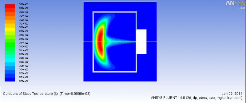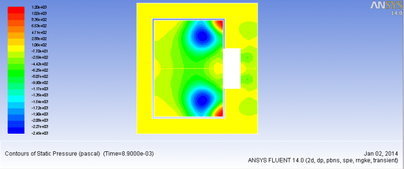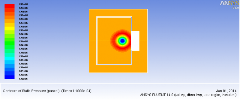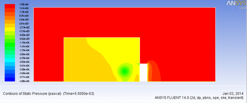 我做了两组模拟,一组是你原来的设置,一组将压力调为0,开始都有点火产生,这个从温度和co2的云图可以看出来,但在4ms左右,火熄灭了。我觉得是你箱体结构的问题,你箱体是内外有孔连接的,是吧?我在高压那组保存了两张速度矢量图,一个是以压力标记颜色的,一个是以速度标记颜色的,从图可以看出,点火后,内箱产生负压,且负压区对应的气流速度较大,所以我认为火焰是被由于内外箱体压差下产生的气流吹灭的。我把模拟结果发到你邮箱,包括case,data(每一ms保存一次),以及温度,co2,压力(常压)云图的动画,你可以参考一下。 [ Last edited by xuchaoyi on 2014-1-2 at 12:06 ] |