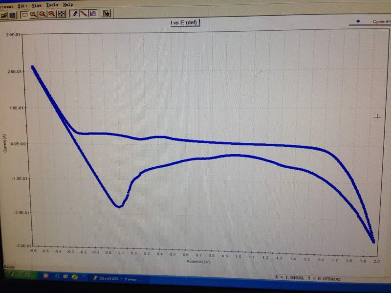 继续测试循环伏安曲线,也是很奇怪的形状,如图2