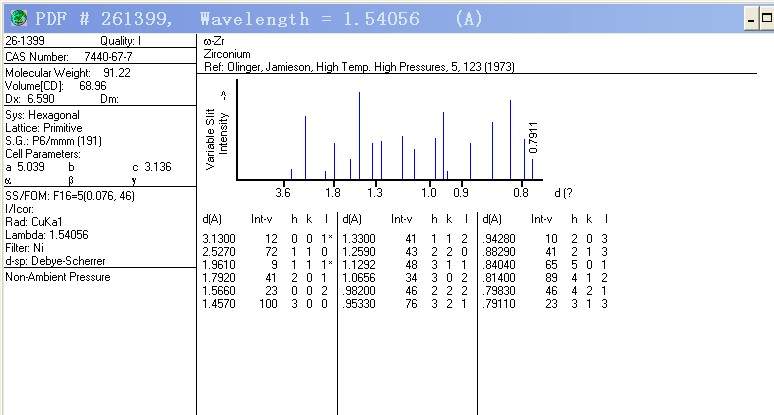 high density的几个峰以及对应的角度 以下两个pdf卡片, 看你的的ZR是那个结构的参数的 http://pan.baidu.com/disk/home |
