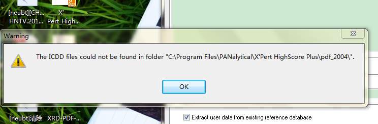 请教一下大家,我在往X'Pert HighScore Plus 中导入pdf_2004时遇到了问题,具体见下图 缺少和ICDD相关的东西,所以没有粉末库,请大家帮忙解决问题啊,万分感激啊~ LLH7M@X$T0X@I8SH_VBTB8A.jpg |