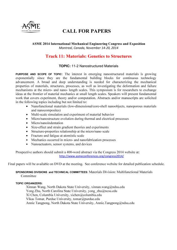 CALL FOR PAPERS Track 11 Materials: Genetics to Structures Topic 11-2 Nanostructured Materials 2014 ASME International Mechanical Engineering Congress and Exposition Montreal, Canada, November 14-20, 2014 The Multifunctional Materials Committee under the Materials Division is sponsoring a nanostructured materials symposium at the 2014 IMECE, Montreal, Canada. The interest in emerging nanostructured materials is growing exponentially since they are the fundamental building blocks for continuous technology advancement. A broad and deep understanding is needed for characterizing the mechanical properties of materials, structures, processes, as well as investigating the deformation and failure mechanisms at the micro- and nano- length scales. This symposium is for researchers to exchange ideas at the frontier of material mechanics at small length scales. Speakers will present fundamental work that covers experiment, theory and/or computation. Abstracts, presentations and/or manuscripts are solicited in the following topics including but not limited to: • Nano-functional materials (low-dimensional/core-shell nanoobjects, nanoporous materials and nanocomposites) • Multi-scale simulation and experiment of material behavior • Micro/nanostructure evolution during thermal and electrical processes • Micro/nanoindentation • Size-effect and strain gradient theories and experiments • Structure-properties relationship at the micro/nano scale • Fracture and fatigue at atomistic scale • Mechanics occurred in micro- and nanofabrication processes • Nano-actuators, sensor systems, and devices Prospective authors should refer to the following schedule for submissions. Authors are directed to the ASME congress website (http://www.asmeconferences.org/congress2014/) for updated deadlines and required online submission guidelines. Publication Schedule Abstract Submission: February 17, 2014 Submission of Full-Length Draft Paper for Review: April 14, 2014 Submission of Final Paper: July 28, 2014 Organizers: Xinnan Wang (xinnan.wang@ndsu.edu), Department of Mechanical Engineering, North Dakota State University, Fargo, ND. Yong Zhu (yong_zhu@ncsu.edu), Mechanical and Aerospace Engineering, North Carolina State University, Raleigh, NC. Xi Chen (xichen@columbia.edu), Earth and Environmental Engineering, Columbia University, New York, NY. Vikas Tomar (tomar@purdue.edu), School of Aeronautics and Astronautics, Purdue University, West Lafayette, IN. We appreciated it if you could help forward this call for abstracts to your colleagues, thanks! Nanostructured Materials 2014 ASME call for papers.jpg |