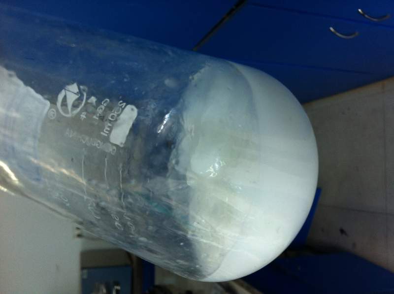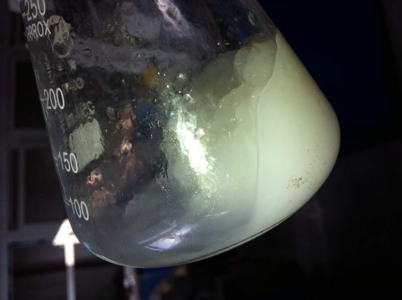 温度确实是45℃,油浴控温,反应器中也有数显温度计,都是45℃,抽气是用水泵,是两个抽气口一起抽的,大概1h,前期有大量小气泡产生,然后有液体被抽出,到了凝胶前几分钟,就出现那种大气泡,类似沸水爆沸那种感觉,然后就凝胶了。