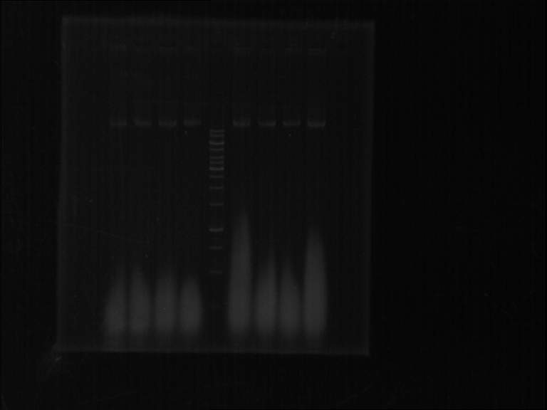 用碱裂解法提取的质粒。质粒大小是10kb.中间是1kb的marker。分别是10kb,8kb,6kb,5kb,4kb,3.5kb.3kb.2.5kb.2kb,1.5kb,1kb,750bp,500bp,250bp.