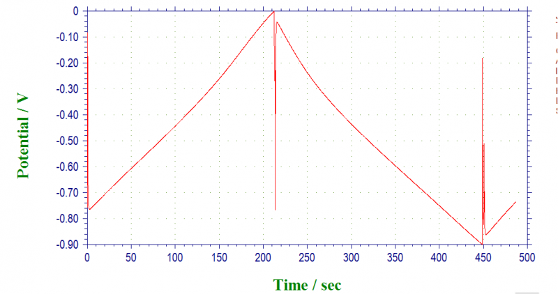我用活性炭做超级电容器电极材料,在测试过程中得到这样的曲线(附件图1,2),请高手帮我分析一下,看看为什么充放电曲线在开始放电时会有几个点在下方(约在-0.8V),而能斯特曲线在低频曲出现曲折。谢谢了!附:6mol的KOH,电位窗口选择(-0.9~0V)。