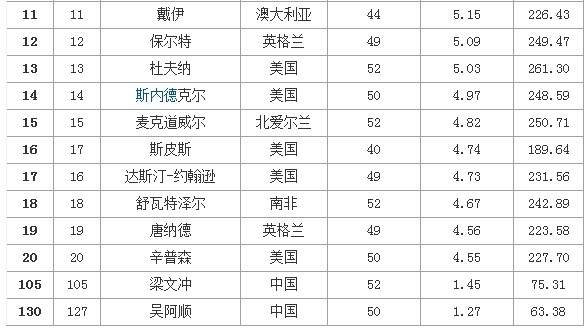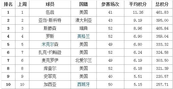 男子世界排名伍兹666周位居榜首 梁文冲维持105