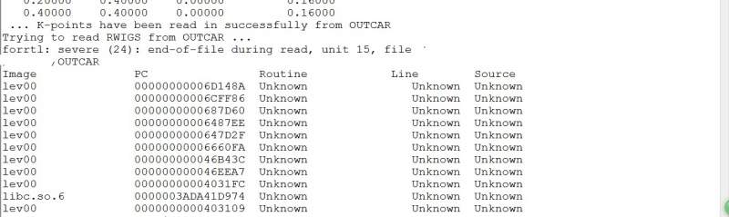 您这么一提醒,我感觉到是不是原子数目太多了。我做表面吸附性质,打开的一个是五十多个原子,八十多个原子,都不行.....原子种树有四种。主要想用其处理电荷密度分布,之前用VESTA做过,但是2D的没有标尺,并且不是很好看。看见侯老师教程里面用origin和gnuplot画的图很好看,所以就想用lev00. 1、编译时按照论坛里面的教程编译的,lev00是最新版的 2、论坛中搜索,有人说是POSCAR/CONTCAR没删除原子名称,但是我删除了也不行 错误信息: 47 1.95090 3.90159 28.90359 F F F 48 3.90159 5.85187 21.04785 F F F 49 3.90159 5.85228 28.90359 F F F 50 5.85187 3.90159 21.04785 F F F 51 5.85228 3.90159 28.90359 F F F ______> Atoms in species 4 ( X) <______ 52 3.90159 3.90159 18.98412 F F F [1] 7.80318 0.00000 0.00000 [2] 0.00000 7.80318 0.00000 [3] 0.00000 0.00000 33.69439 (原子的坐标信息) Done geometry! Trying to read k-points from KPOINTS ... Trying to read k-points from OUTCAR ... 0.00000 0.00000 0.00000 0.04000 0.20000 0.00000 0.00000 0.16000 0.40000 0.00000 0.00000 0.16000 0.20000 0.20000 0.00000 0.16000 0.40000 0.20000 0.00000 0.32000 0.40000 0.40000 0.00000 0.16000 ... K-points have been read in successfully from OUTCAR Trying to read RWIGS from OUTCAR ... forrtl: severe (24): end-of-file during read, unit 15, file /home/....../......./OUTCAR (OUTCAR绝对途径) Image PC Routine Line Source lev00 00000000006D148A Unknown Unknown Unknown lev00 00000000006CFF86 Unknown Unknown Unknown lev00 0000000000687D60 Unknown Unknown Unknown lev00 00000000006487EE Unknown Unknown Unknown lev00 0000000000647D2F Unknown Unknown Unknown lev00 00000000006660FA Unknown Unknown Unknown lev00 000000000046B43C Unknown Unknown Unknown lev00 000000000046EEA7 Unknown Unknown Unknown lev00 00000000004031FC Unknown Unknown Unknown libc.so.6 00000035BEE1D974 Unknown Unknown Unknown lev00 0000000000403109 Unknown Unknown Unknown |