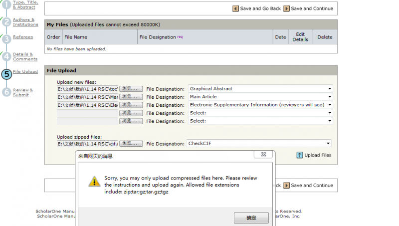 各位高手,最近在投 RSC Advances,上传文件时 需要上传pdf的吗?还是要压缩?我直接上传的文章的word03 和3个单晶的压缩cif文件,点击上传时就出现下边的情况。。。还望大家指点迷津,谢谢! 搜狗截图14年01月15日0952_1.png |