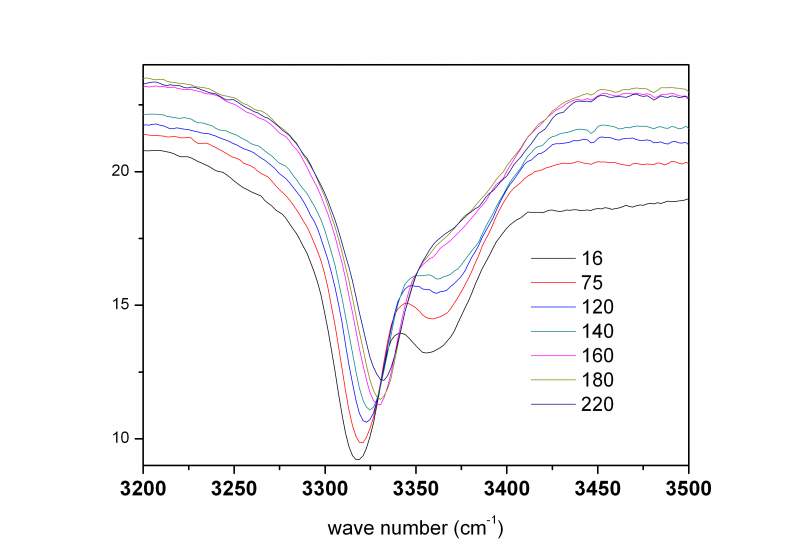 样品中的关键基团是一个酰胺。分子间通过这个酰胺基团形成氢键。 现在用变温红外测试其结构随温度的变化。3300左右N-H键的峰如图所示。大的峰随温度升高而移动了,小的峰直接消失了。 求问,这两个峰具体说明了什么,结构的变化可能是什么。 谢谢! Graph1.jpg |
