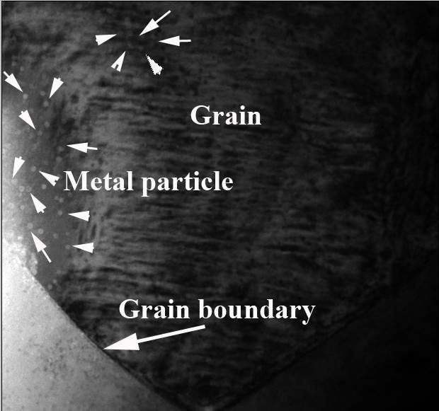 最近在做用无机材料与金属颗粒制备复相材料的工作,TEM发现金属颗粒分布在基体(陶瓷)晶粒内部,如图所示,但是老板认为金属颗粒是不能进入陶瓷晶粒内部的,应该分布在晶界处。感到很迷惑,各位大牛,发表一下自己的意见,给小弟一点建议,应该从哪些方面进一步验证这些颗粒分布的状态,谢谢!