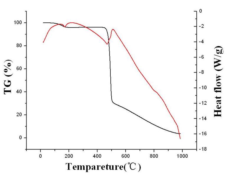 TG曲线上迅速失重的曲线段跟对应DSC上的峰应该是热分解造成的.从你的图上看,热分解温度在500度左右.